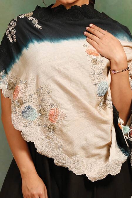 Black tussar off-shoulder top featuring floral embroidered motifs and asymmetric sleeves. Paired with a silk muslin jumpsuit that is sleeveless and showcases embroidered borders.