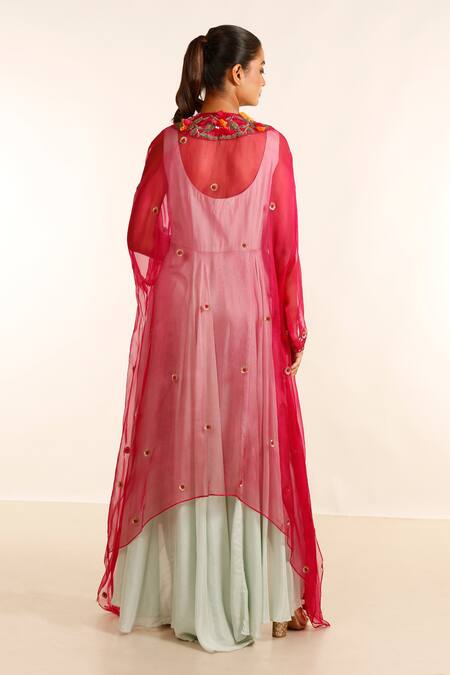 Blue gown featuring a U neck and sleeveless design with a side zip closure. Paired with a fuchsia hand embroidered asymmetric jacket adorned with floral motifs.
