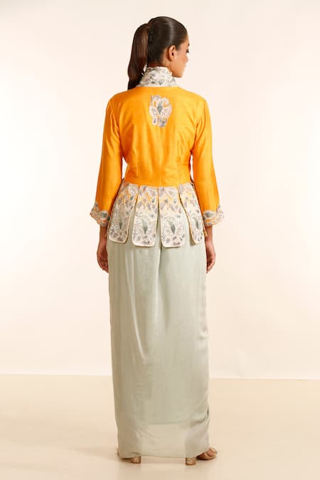 Orange peplum jacket featuring floral hand embroidery and a stand collar. Paired with an ice blue draped skirt made from silk muslin and dola silk.