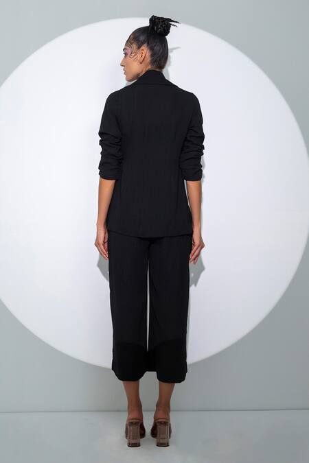 Black gathered sleeve jacket featuring a lapel collar and angled front pockets