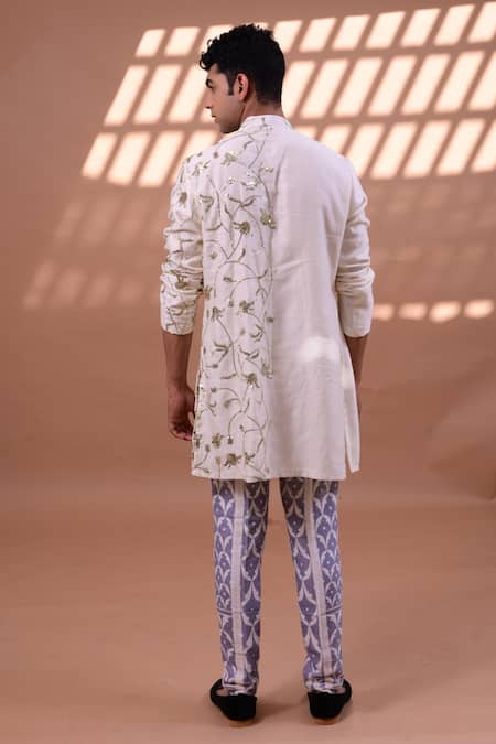 White open front jacket kurta with sequin work on the side. Comes with hand block printed straight pants.