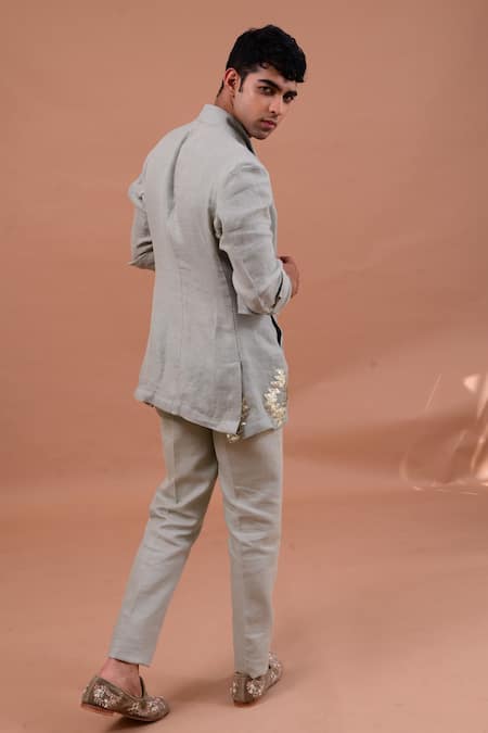 Aqua jacket with sequin work and flap collar. Comes with straight pants.