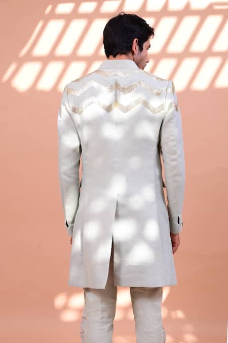Aqua sherwani with sequin work and flap pockets. Comes with straight pants.