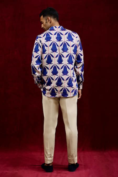 Blue shirt featuring a stand collar and full sleeves with a hand-painted lotus pattern