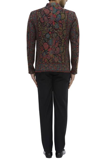 Black bandhgala with all-over woven floral motifs.
