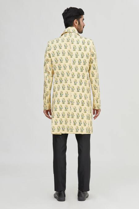 Yellow Raw Cotton Printed Sherwani