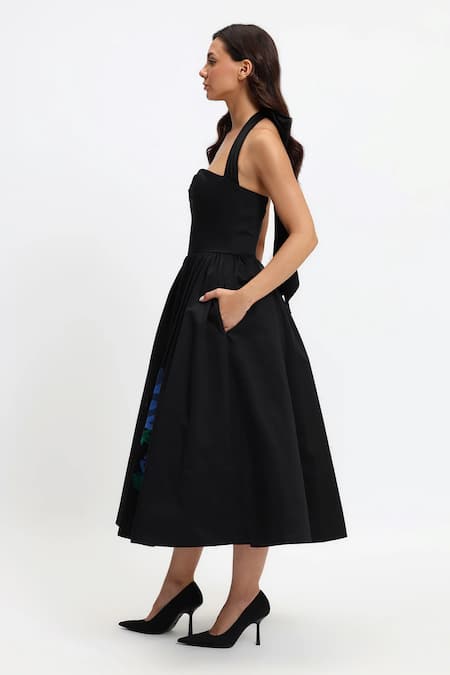 Black midi dress featuring placement embroidery in a botanical pattern and a sweetheart halter neck