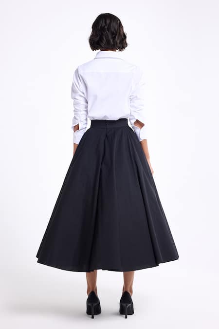 A white poplin cotton shirt features a classic collar and long sleeves with buttoned cuffs.