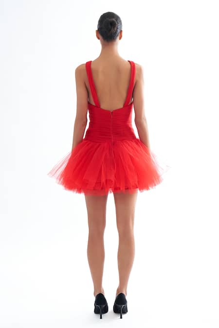 Red cutout drop waisted short dress featuring a fluted, corseted bodice and criss-cross neckline