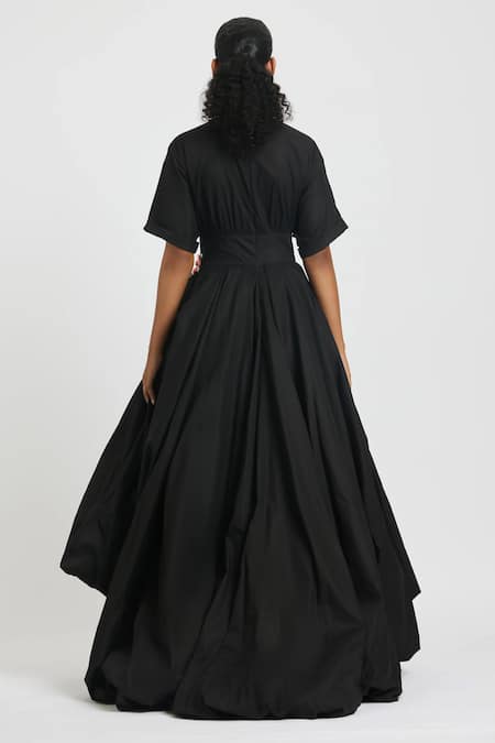 Black asymmetric balloon shirt dress featuring floral detailed waist