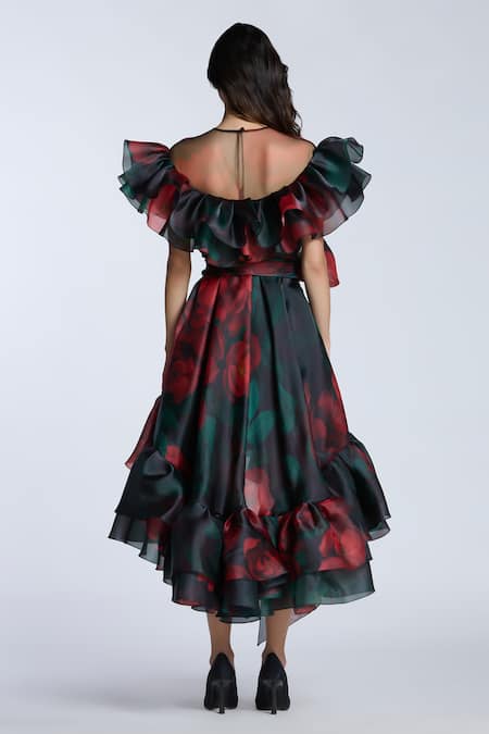 Black Organza Ruffles Round Neck High Low Rose Print Dress