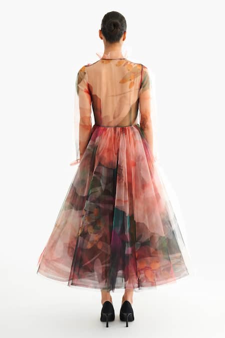 Black Net Collared October Print Midi Dress