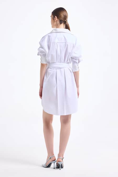 A white oversized shirt dress crafted from poplin cotton, featuring a collared neckline and floral embroidery on the front. It is paired with a coordinating tie-up belt.