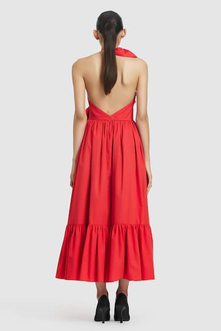 Red Cotton Ruffles Asymmetric Detailed Front Midi Dress