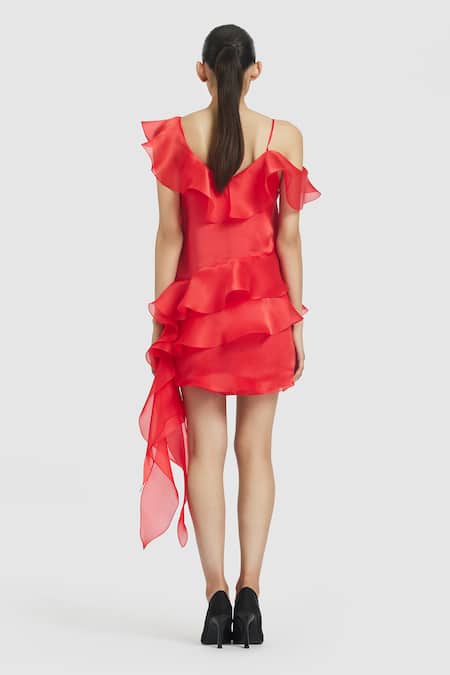 Red Organza Asymmetric Ruffled Short Shift Dress
