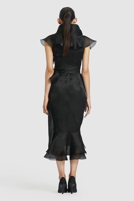 Black midi dress featuring ruffled sleeves and a shawl collar