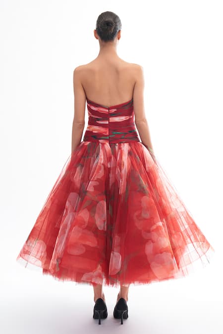Red midi dress featuring a sweetheart neckline and drop waisted design