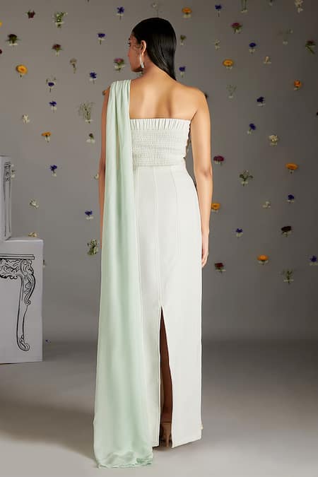 Beige and green pre-draped saree gown featuring gathers detailing and an asymmetric neckline