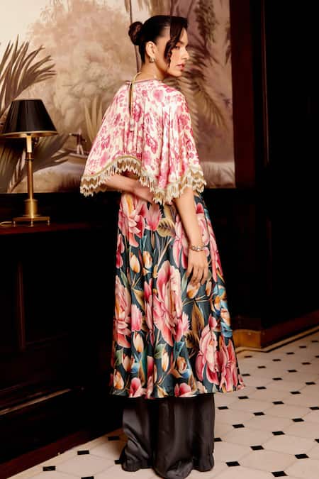 Multicolor floral print anarkali featuring attached cape with crystal tassel embellishments. Paired with matching flared pant in cupro satin fabric.