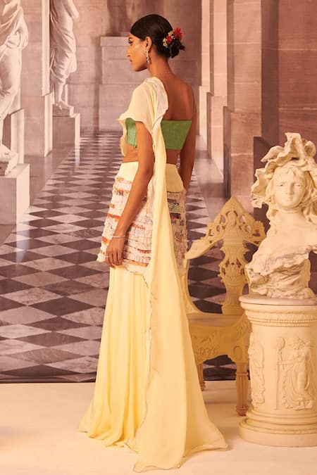 Yellow and multi-color pre-draped saree featuring handcrafted textile detailing