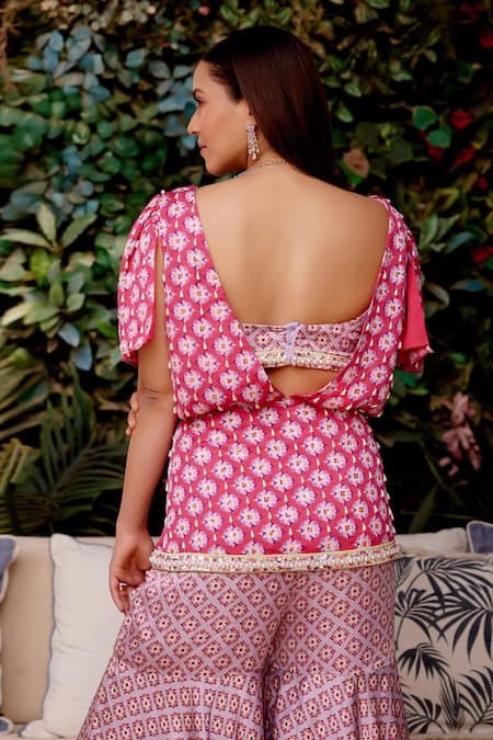 Pink peplum style jacket featuring geometric and floral prints highlighted by pearl drops. Paired with an inner padded blouse and matching sharara.