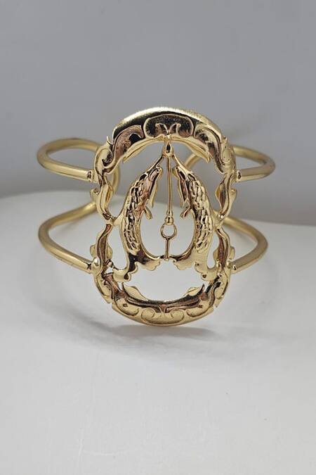 Gold plated half metal carved fish bracelet featuring a unique fish design