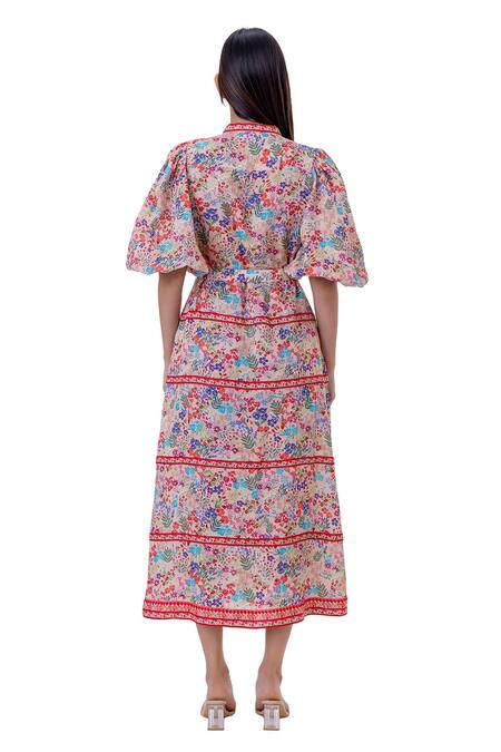 Multicolored midi dress featuring puff sleeves and a notched neckline. Comes with a matching fabric belt and panelled details.