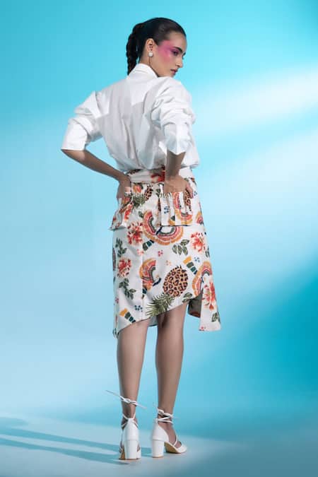 White shirt featuring a shirt collar and full sleeves. Paired with a floral-bird printed ruffle draped skirt made from linen cotton.