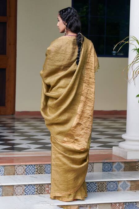 An olive green saree crafted from 100% linen and zari, featuring a woven stripe pattern and bead drops on the pallu. Comes with a running blouse.