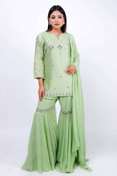 Green kurta featuring cut dana embellished yoke highlighted with mirror work. Paired with a gharara and dupatta made from georgette.