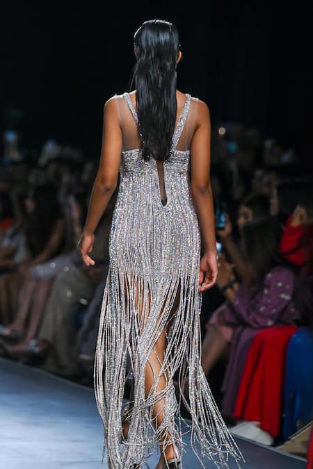 Silver Nylon Embroidered Crystal Cord Work Arietta Tasselled Gown