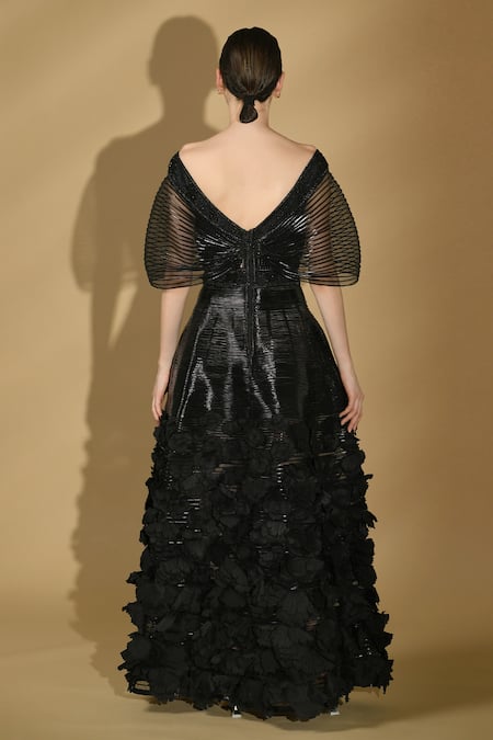 Black Nylon 3d Flowers Broad And Brigitta Pattern Structured Gown