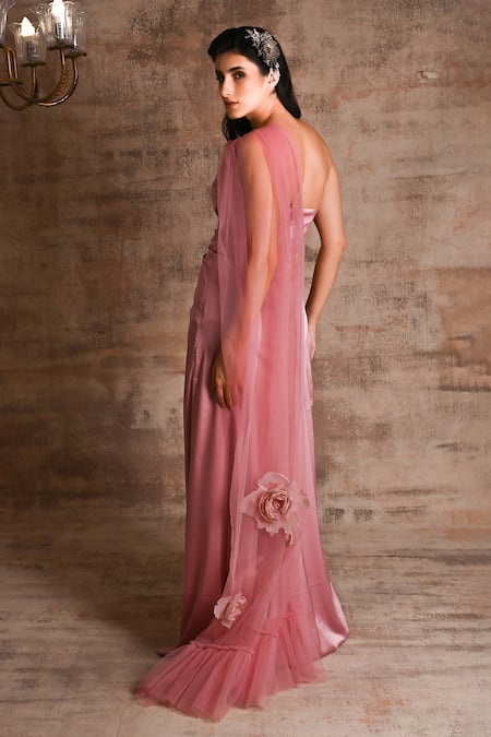 Pink Polyester Embroidered 3-d Applique One Delnaz Draped Gown