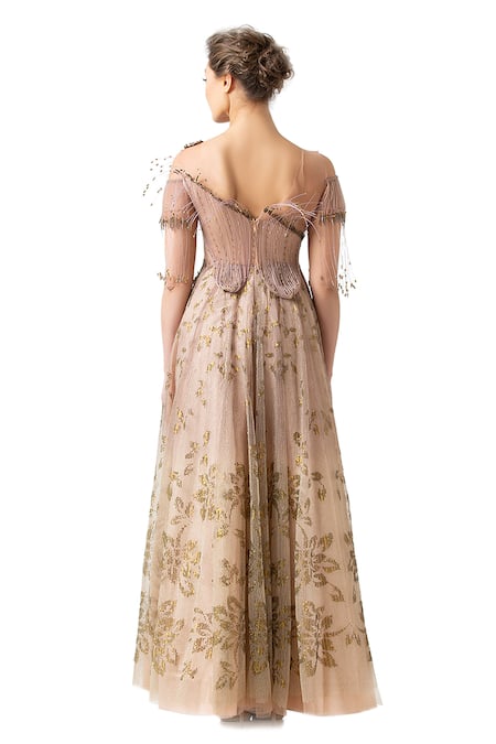 Rose gold off shoulder gown with floral motifs, fringe sleeves & embellished bodice.