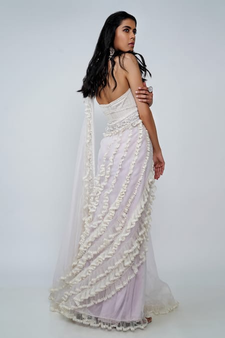 Lilac pre-draped skirt saree with high-slit, frill detail & placement embroidery. Comes with gathered bandeau cropped blouse.