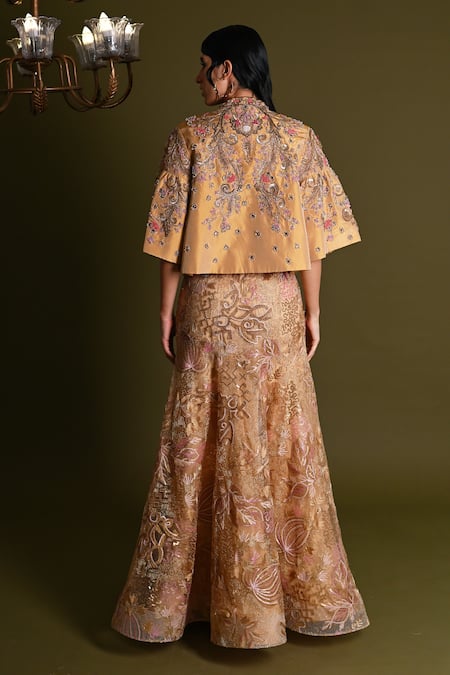 Gold lehenga featuring thread embroidered floral and geometric motifs with sequins and crystals. Paired with a pearl and sequin embroidered floral swirl patterned jacket.
