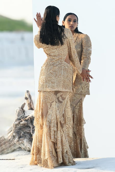 Gold hand embroidered jacket featuring sequins and beads with a shawl lapel. Paired with a matching skirt that has an attached lining.