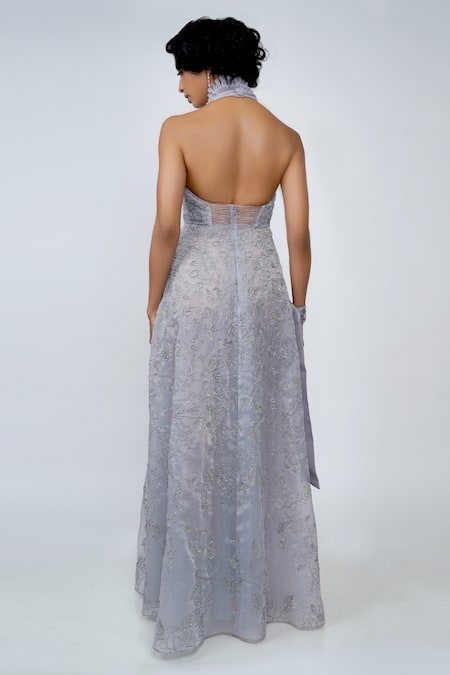 Blue backless flared gown with thigh-high slit, frill halter neck, floral motif bead work & gathered yoke.