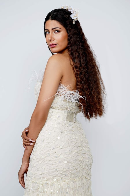 Off-white bandeau fish-cut gown with faux feather neckline, all-over embellishments & textured detail. Comes with belt.