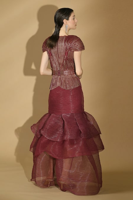 Maroon structured top featuring a plunging leaf neckline, cap sleeves, and metallic embellishments. Paired with a layered, structured skirt with pintucks and a belted waist.