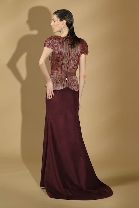 Maroon structured top featuring a plunging leaf neckline, cap sleeves, and metallic embellishments. Paired with a plain A-line skirt with a trail.
