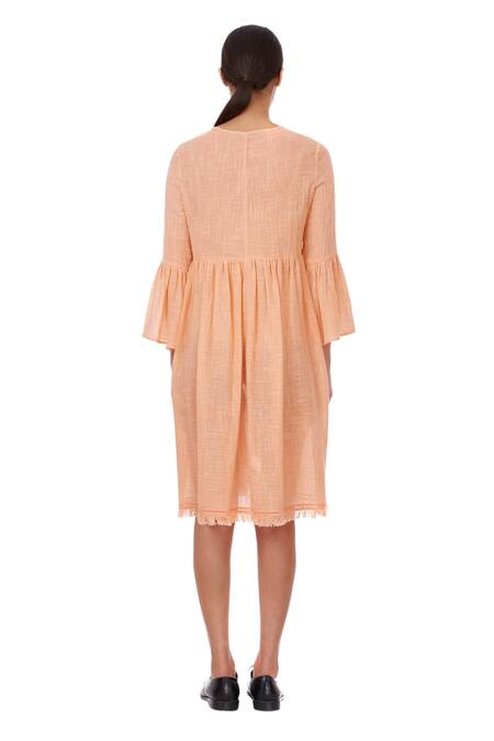 Notched round neckline >Tie-up with tassels >Tassels trim at the hem