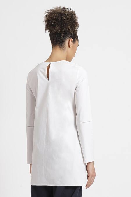 White Non Stretch Poplin Round Myecelia Short Slit Tunic