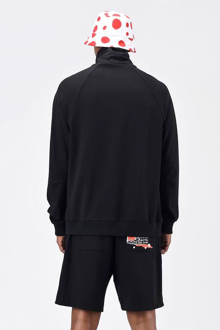 Black turtle neck sweatshirt with typography and textured polka placement print.