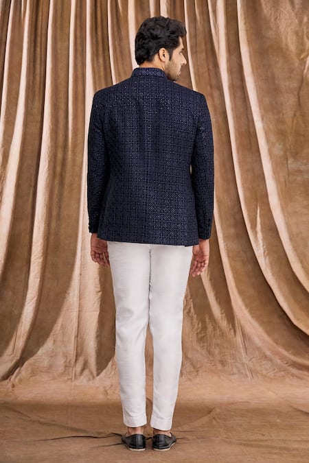 Dark navy bandhgala with geometric motifs in sequin embellishments.