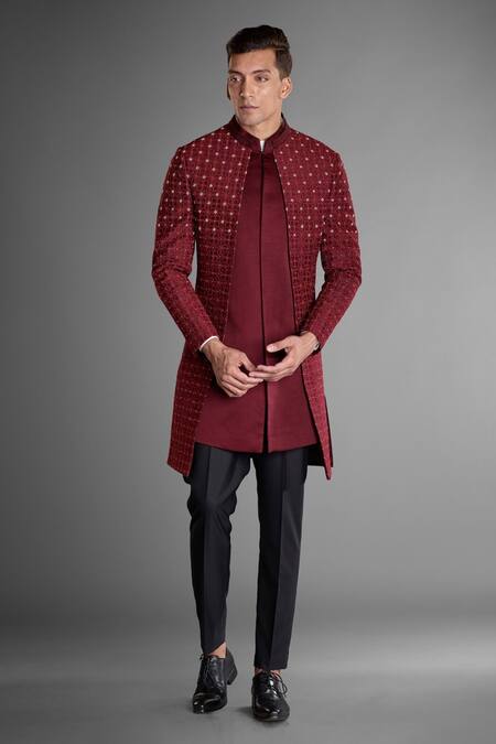 Maroon geometric embroidered sherwani featuring a mandarin collar and full sleeves. Paired with a cotton shirt and trousers.
