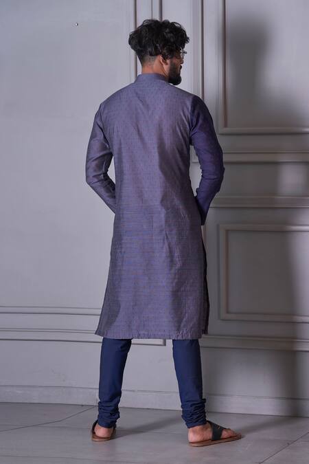 Blue, grey kurta with geometric embroidery & front slit detailing. Paired with pant.