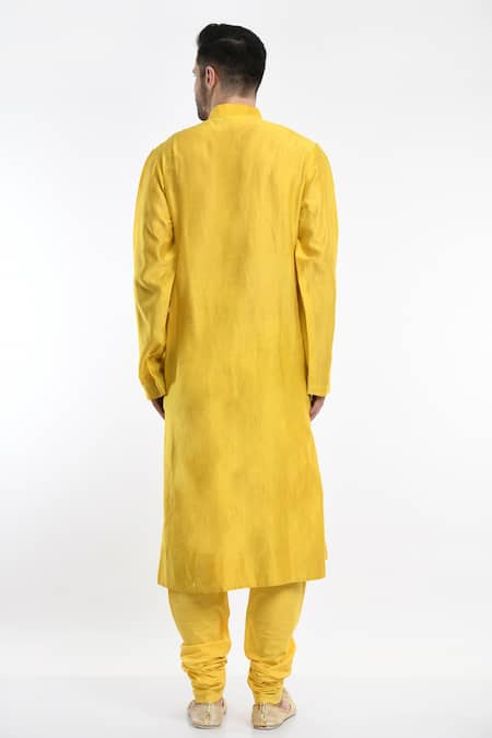 Yellow kurta featuring geometric embroidery and a mandarin collar. Paired with a churidar for a complete look.