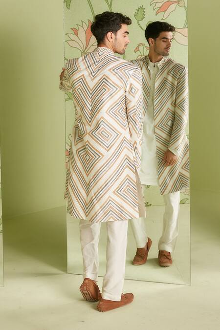 Buy_Sanjev Marwaaha_Ivory Cotton Silk Applique, Cord Geometric Embroidered Long Jacket Kurta Set_at_Aza_Fashions