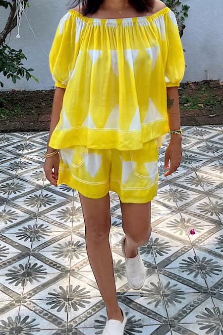 Yellow Cotton Bamboo Geometric Pattern Shorts